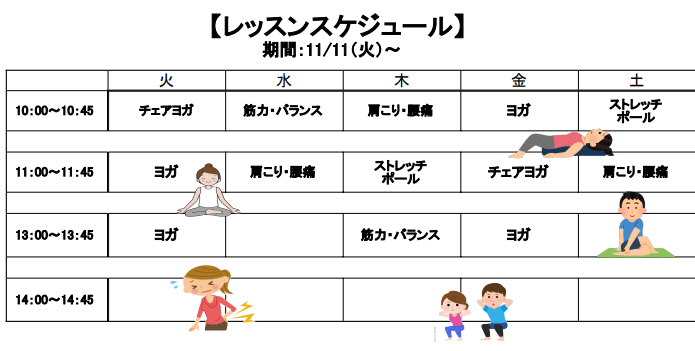 動きやすい衣類、室内履き、汗拭きタオル、水分などをお持ちください。